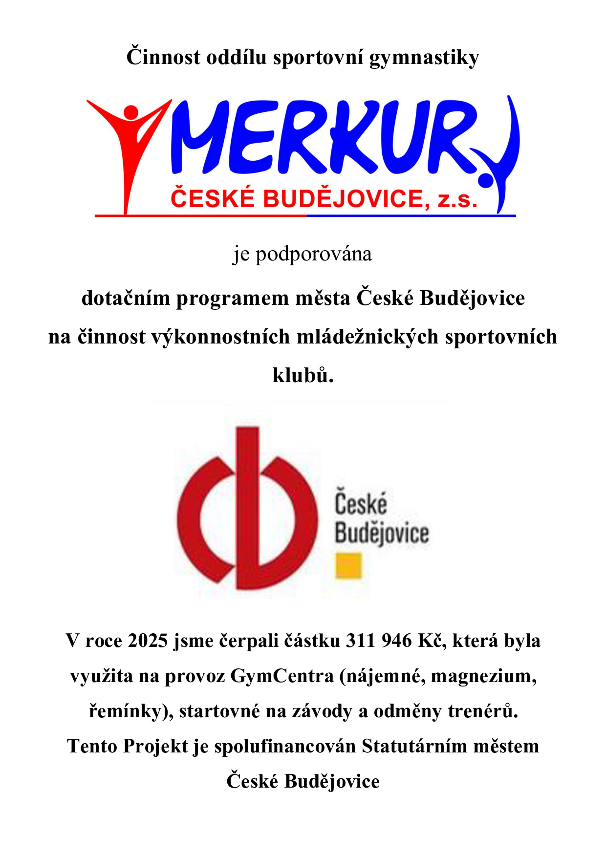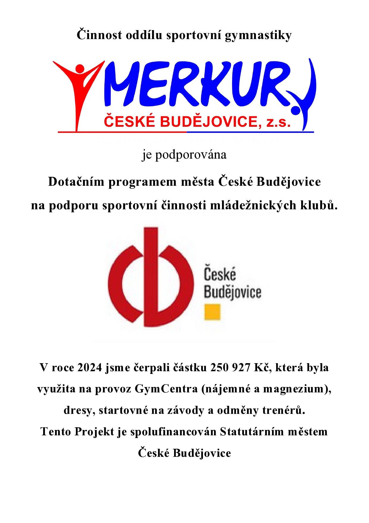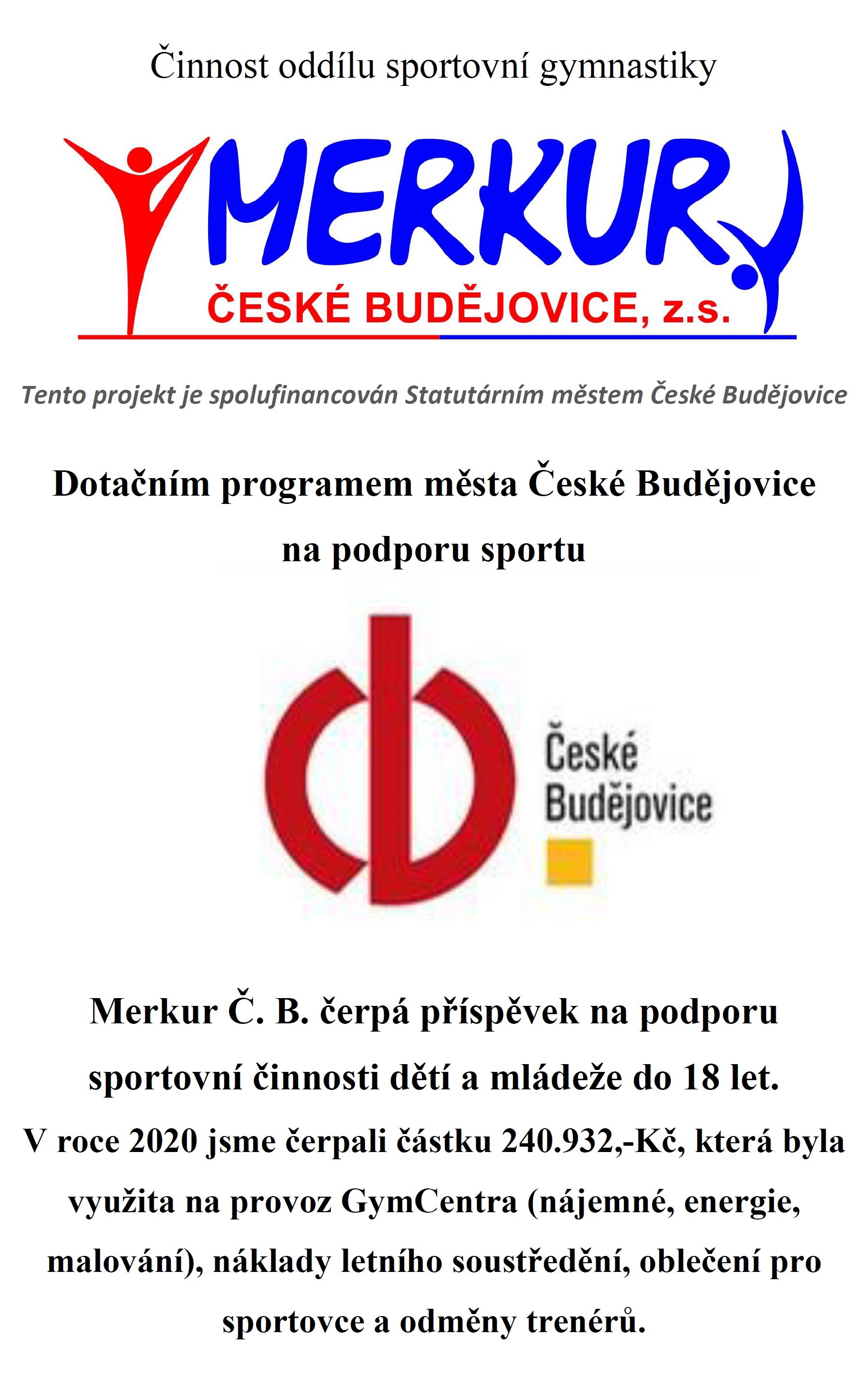 Činnost oddílu sportovní gymnastiky TJ Merkur je dlouhodobě podporována dotačním programem města České Budějovice na podporu sportu. TJ Merkur čerpá každoročně příspěvek na podporu sportovní činnosti dětí a mládeže do 18 let.